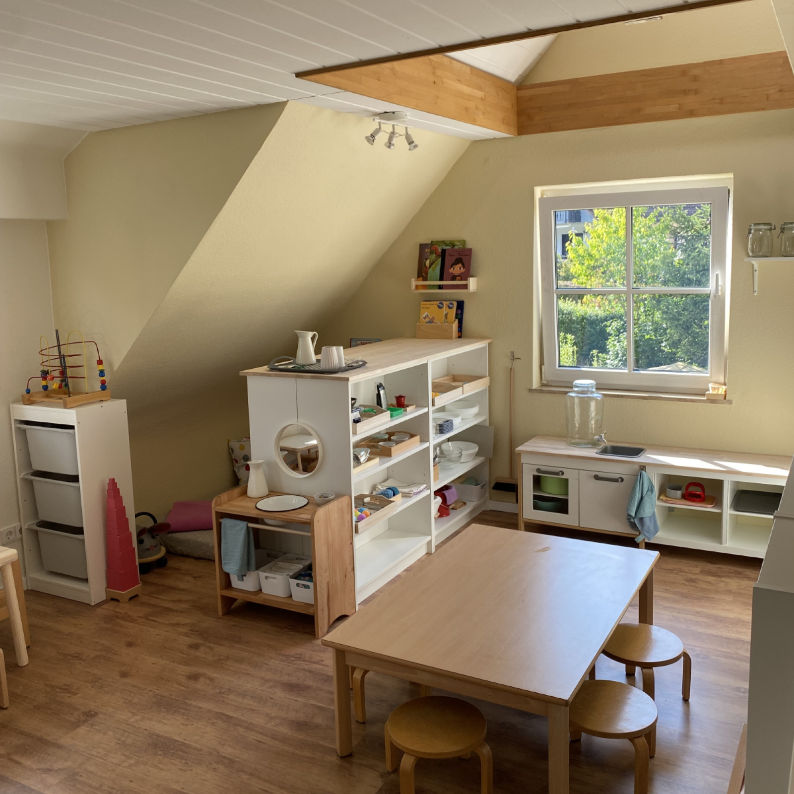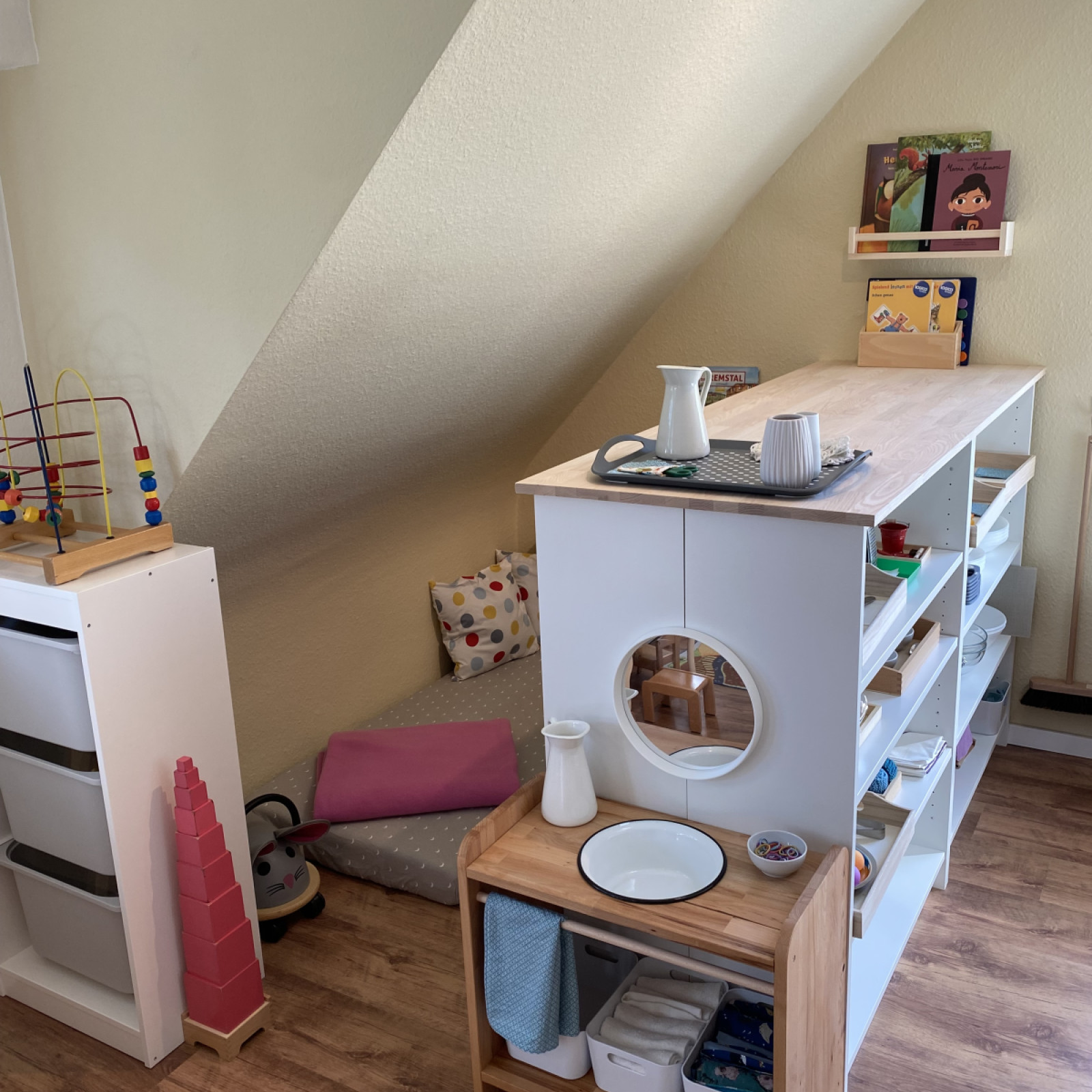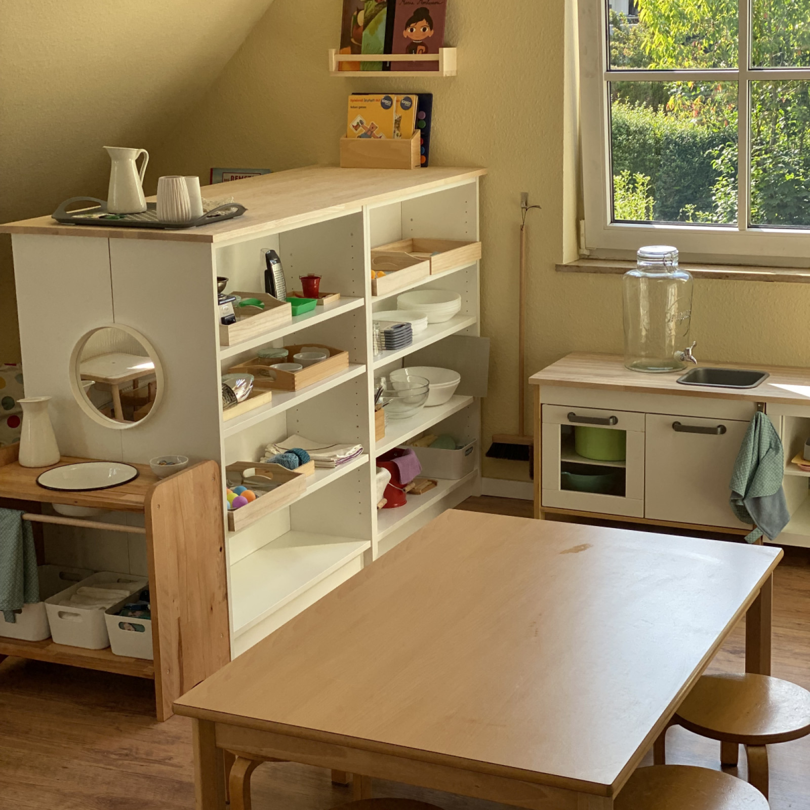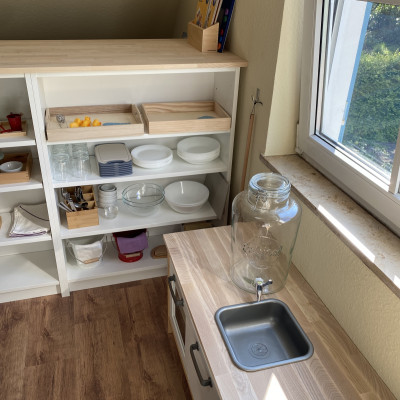 Kinder haben besondere Bedürfnisse an die Einrichtung. Um sich auszuruhen gibt es einen Rückzugsbereich im Raum. Für den Mittagsschlaf hat jedes Kind seine eigenen Matratze. Die Küche ist besonders wichtig und auf die Betrübnisse der Kinder angepasst, so können wir gemeinsam das Frühstück vorbereiten hier bereiten wir und die Mahlzeiten zusammen am großen Tisch schmecken lassen. Der Betreuungsraum ist in Räumen verschiedene Bereiche strukturiert, das Angebot und die Materialen werden je nach den Bedürfnissen und Entwicklungsstand der Kinder angepasst.