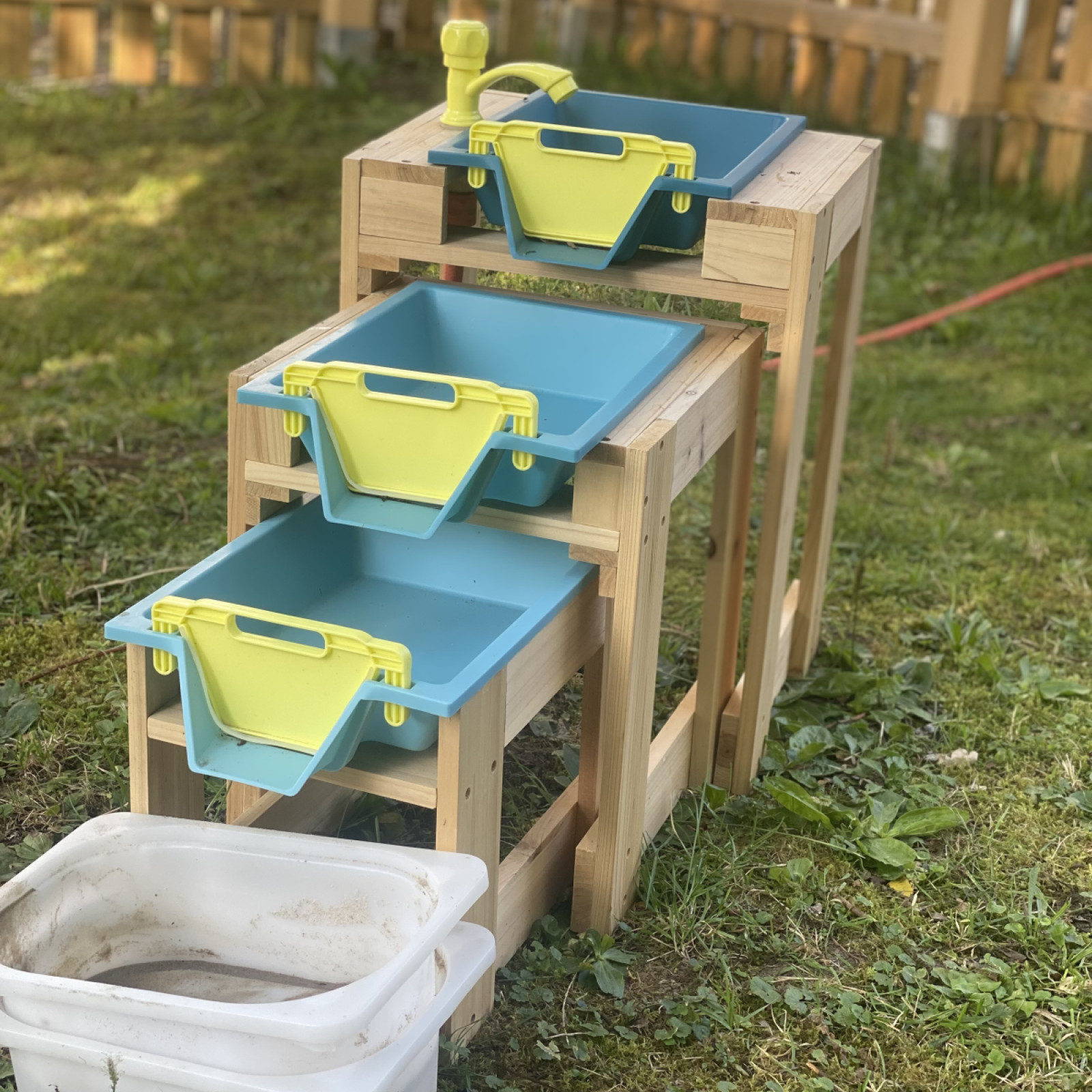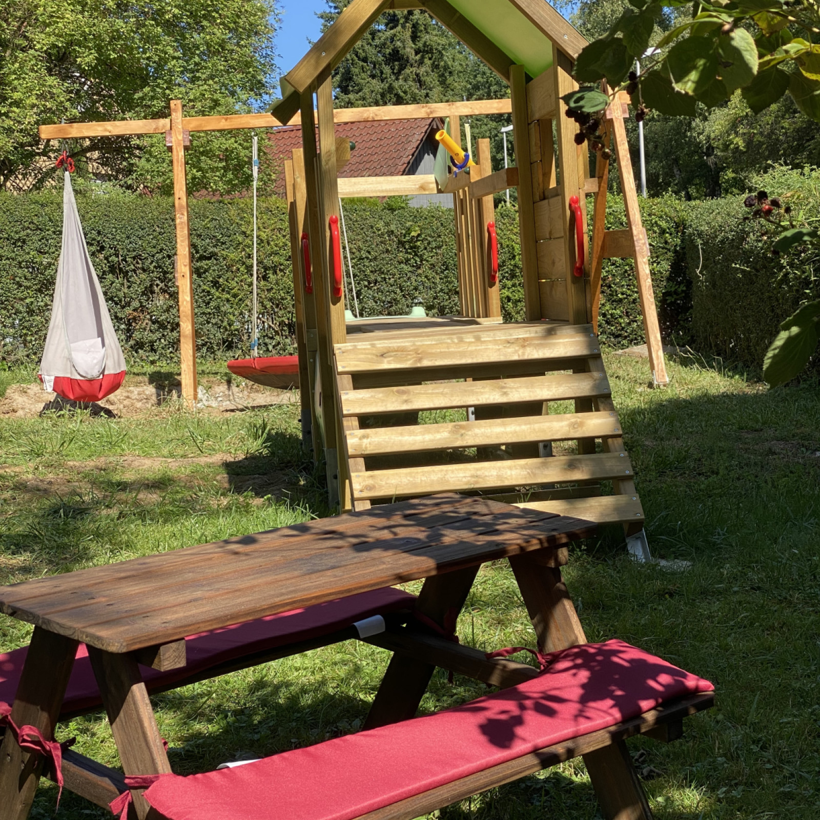Eine kleine Sitzgruppe bietet zusätzlich Raum für gemeinsames Malen, Basteln oder ein Picknick im Freien. Auch hier steht das selbstständige Tun im Vordergrund – die Kinder dürfen ihre Ideen einbringen und eigene Entscheidungen treffen.